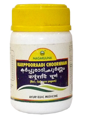 Karpooradi choornam is a mixture of dry herbal powder along with sugar used in the management respiratory system related problems. Indication: Cough, cold, anorexia, hiccup, pain, nausea, indigestion and vomitting.