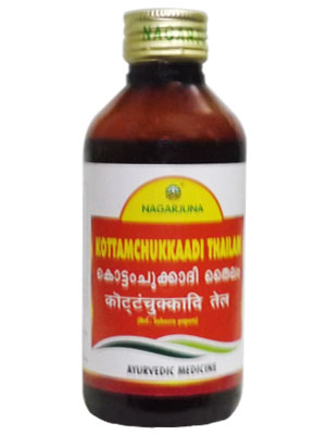 Kottamchukkadi Thailam is an Ayurvedic oil used in the treatment of Vata disorders causing neuro muscular pains, sciatica, spondylosis etc. This oil is formulated based on Kerala Ayurveda practice. Kottamchukkadi Tailam uses: It helps to relieve pain and inflammation. It is used in arthritis, sciatica, myalgia, spondylosis, neck sprain, ankle sprain, blunt injury of knee etc. How to use Kottamchukkadi Taila ? It is used for massage and Ayurvedic therapies like Dhara. How long to use? SInce it is only used for external application, this can be applied over the painful swollen areas for a very long period of time. Kottamchukkadi oil side effects: There are no known side effects of this oil on external application. Kottamchukkadi Thailam ingredients: 21 grams of each of Kottam – Saussurea lappa Chukku – Ginger – Zingiber officinalis Vayambu – Acorus calamus Shigru – Moringa oliefera Lashuna – Garlic – Alium sativum Karotti – capparis sepiaria Devadruma – Cedrus deodara Siddartha – Mustard – Brassica juncea Suvaha – Rasna – Pluchea lanceolata Tilataila – Oil of Sesasmum indicum – 768 ml Dadhi – Curds – 768 ml Chincha rasa – Tamarind juice – 3.072 liter Reference: Sahasra Yoga Taila Prakarana – 12 Expiry date: 3 years from the date of manufacture. Once you open the seal, it is better to use it within an year.
